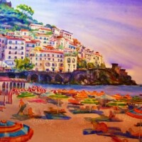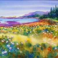 Marybeth’s watercolor palette is bright, joyful, and full of life. Rather than simply recreating a photo, she enhances colors to capture feeling—warmth, nostalgia, and personality. Her playful wildlife pieces, like colorful moose and chameleons, showcase her love of pure pigments, energetic splatters, and a touch of whimsy.